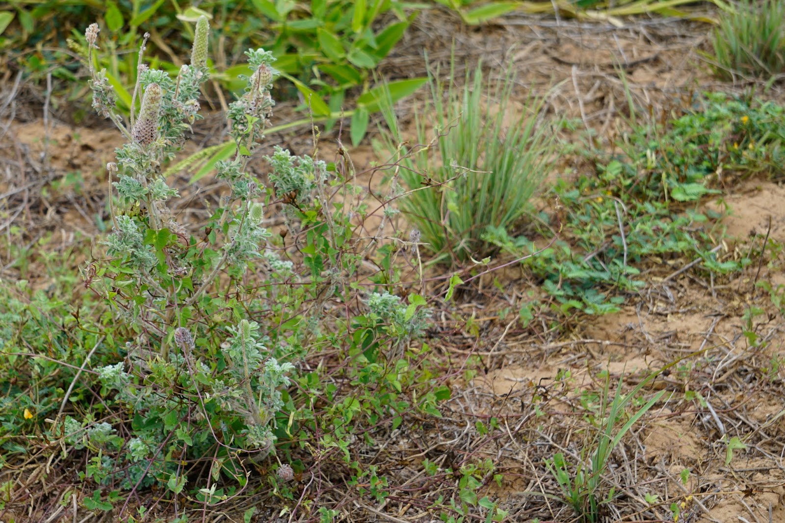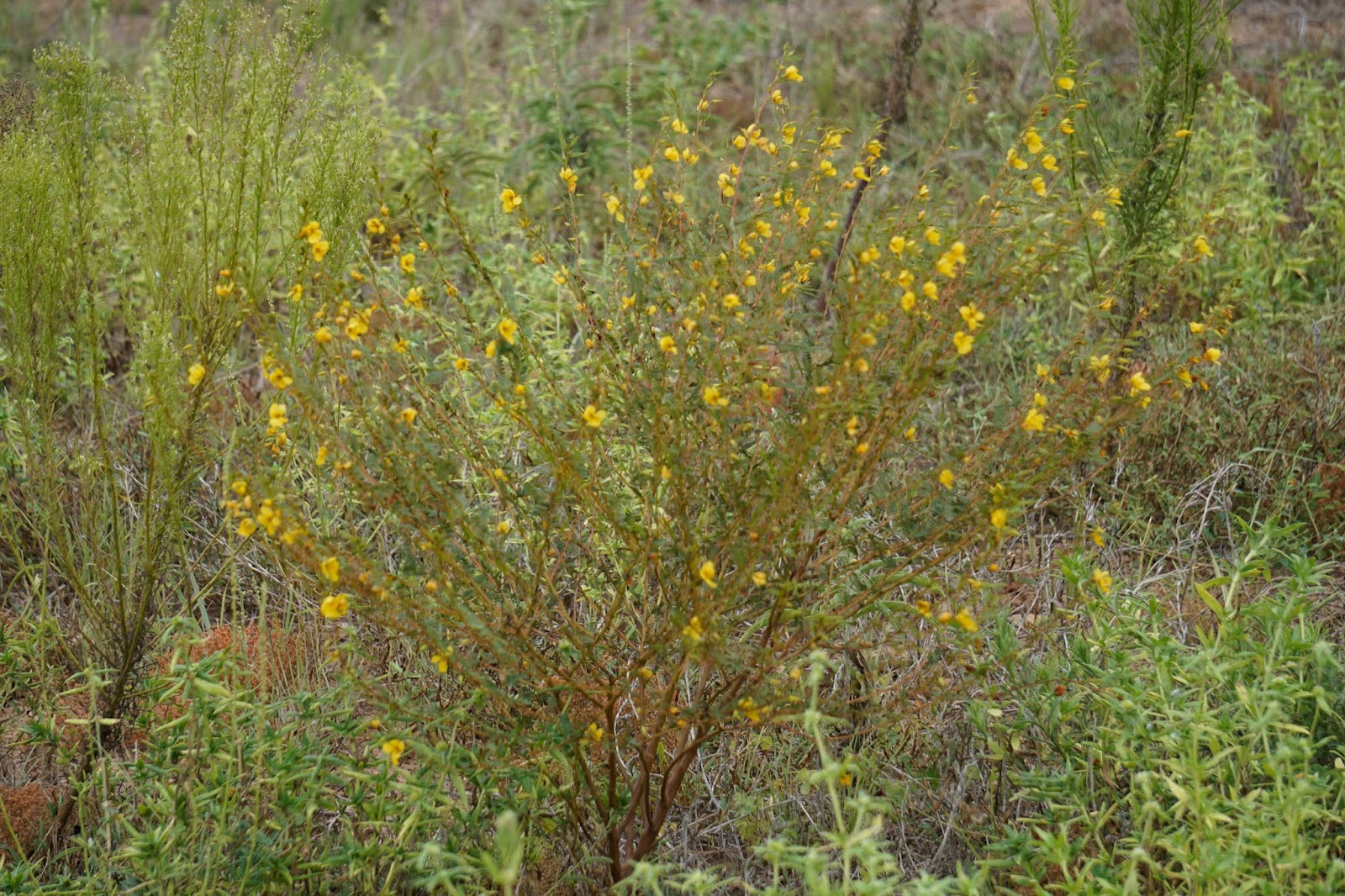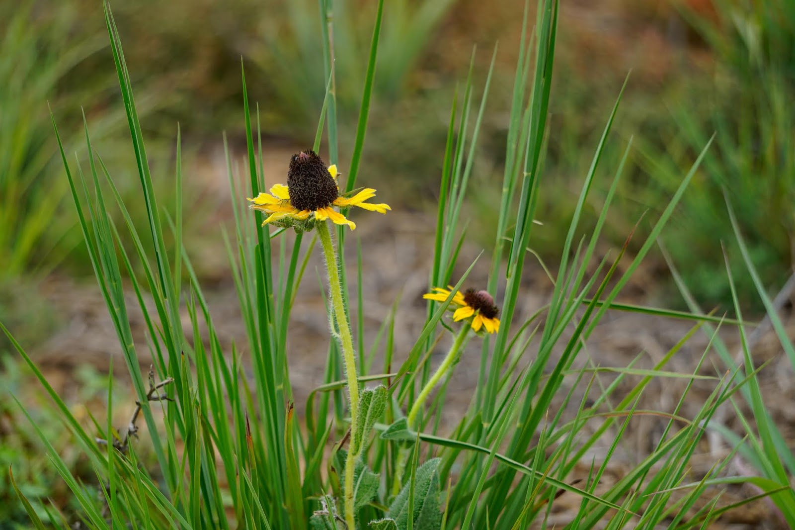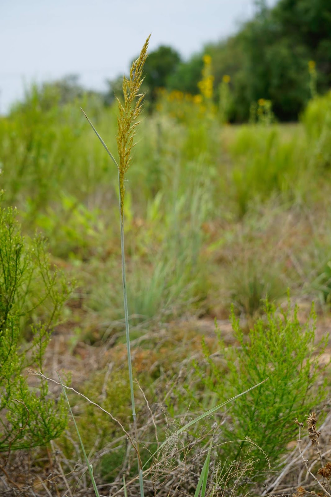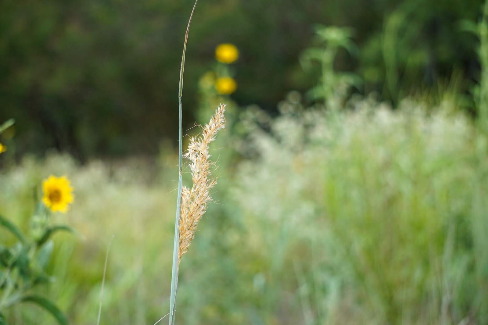 So my walk in the field today was noisy. The sounds of thousands of grasshoppers fleeing from my presence were accompanied by the crunch of my steps on the dried rust weed. Despite the heat and drought, however, the native grasses continue to progress. In parts of the field they are sparse and small, hidden under the canopy of the Mare’s Tail that took an opportunity to flourish this summer. In other places they are plentiful, but small and dry. But in the twenty or so acres nearest the house, they are growing in good numbers and size. Many are forming their seed heads––Little Bluestem, Indian Grass, Lovegrass, Sideoats Grama, and Switchgrass are discernible. Most of the clumps are mysteries to me until they identify themselves with their distinctive seed heads. The yellow Partridge Pea bushes are plentiful. I found one Texas Coneflower blooming in the middle of one of the bunch grasses.